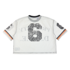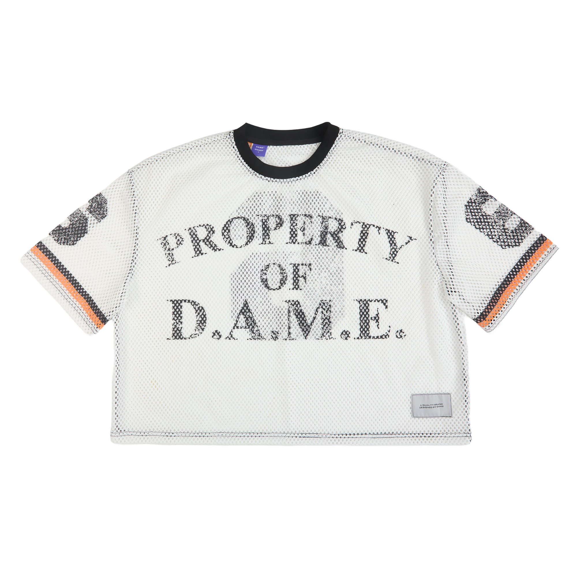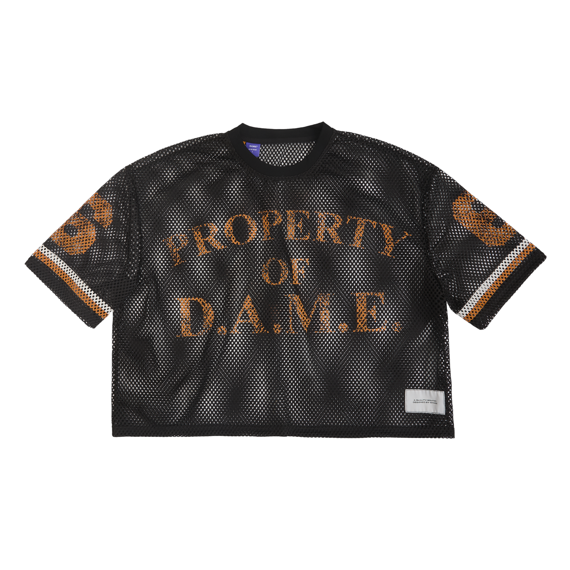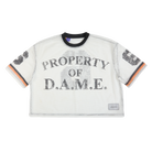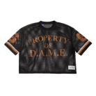 Own your power in the D.A.M.E. Scrimmage Jersey—a fearless take on athletic wear. This cropped mesh piece delivers an oversized, unrestricted fit that moves with you, while the "Property of D.A.M.E." front logo and commanding number 6 declare your allegiance to bold self-expression. Built for those who demand more from their wardrobe.